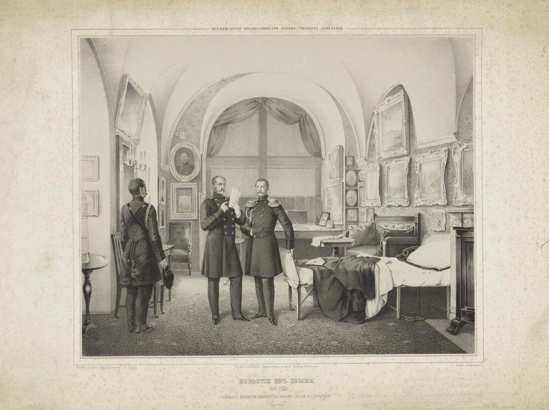 Сильно подержанное французское Евангелие, подарок Александра Павловича (его он, как сам мне говорил, читал каждый день, с тех пор как получил его в Москве после беседы с братом Александром у Храма Спасителя); экземпляр Фомы Кемпийского, которого он стал читать после смерти дочери (Александра Николаевна), несколько семейных портретов, несколько батальных картин по стенам (он их собственноручно повесил), туалетный стол без всякого серебра, письменный стол, на нем пресс-папье, деревянный разрезательный нож и одесская бомба: вот его комната.