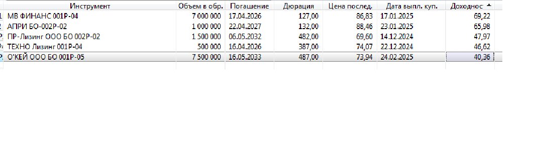 Итак, вот список облигаций с доходностью к погашению выше 40% годовых в моем watch-листе.