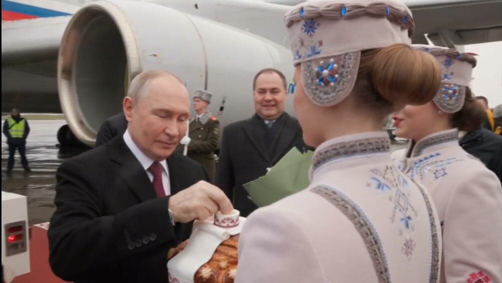 Путина встретили в аэропорту Минска караваем по прилете на заседание Госсовета Союзного государства