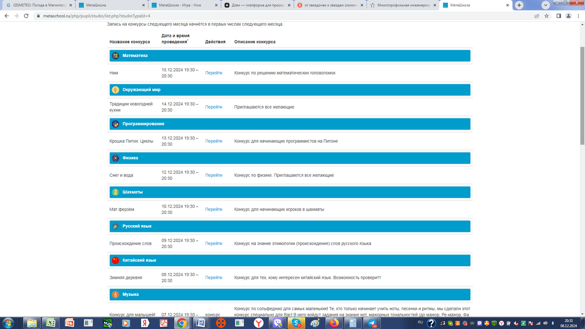 1. (начальная школа) Тут в сетевом городе было объявление про олимпиаду Звезда, но я напишу про "От звёздочек - к звёздам!". Она для начальной школы, не перечневая, правда бесплатная и нам очень нравилась. У нее очень интересные задания были в заключительном туре. Сын и историю писал - надо было предложить что напечатать на монете и объяснить свой выбор, и инженерное что-то, тоже было какое-то интересное задание не стандартное. На сайте сказано, что: "Первый этап олимпиады пройдет с 27 января по 28 февраля 2025 года. Более подробная информация будет размещена в разделе 1 тур." Не нашла информации про регистрацию, наверное будет позже. А первый отборочный тур весьма классический. Информатика - задачи на логику и комбинаторику, по истории тоже - вопросы по истории и т.п. Я сама записываю олимпиады в файл. Вот тут писала, как я его веду: 2. (не начальная школа) На Звезду идет регистрация, но у нее вроде только инженерная теперь в перечне 3 уровня, но в Магнитке ее пишут много, по разным