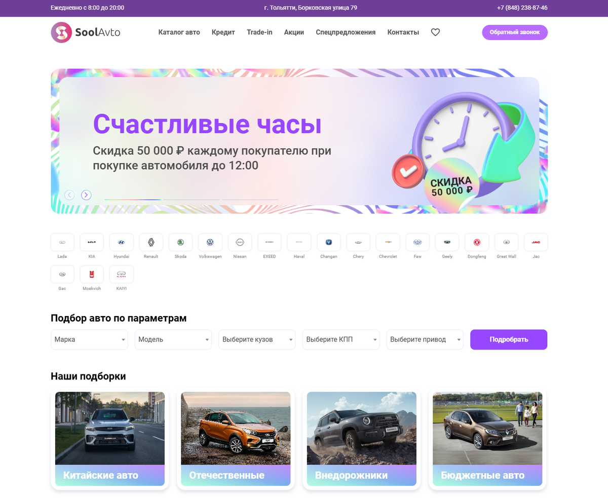 Еще больше о Соол Авто читайте на сайте! Приветствуем всех, кто ищет новые автомобили по выгодным ценам! Автосалон «SoolAvto», расположенный в городе Тольятти на Борковской улице, 79, открыл свои двери для новых клиентов, ведь автосалон предлагает автомобили по ценам, гораздо ниже рыночных. Такие низкие цены привлекают взгляды людей, которые находятся в поиске нового автомобиля. На сайте автоцентра есть несколько классических акции и спецпредложений для новых клиентов, например, акция «Счастливые часы», с помощью которой клиент получит скидку 50 000 рублей при покупке авто до 12:00. Также, «SoolAvto» дарит подарки при покупке авто в кредит, такие как: оплата страховки, комплект резины и заправка полного бака. Цены в объявлениях по продаже новых автомобилей на сайте кратно ниже рыночных, благодаря чему у «SoolAvto» есть постоянный поток посетителей. Но не одним сайтом «SoolAvto» генерирует трафик новых клиентов – у автосалона налажена работа контактного центра, который занимается прозво