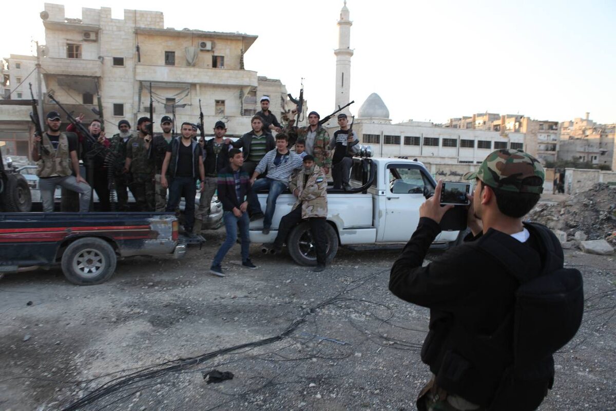 В деревенском домике рядом с Алеппо я расспрашивал лежавшего на полу на матрасе раненного в спину боевика. Оказывается, элитный офицер армии правительства Сирии «еще в детстве мечтал об участии в джихаде и хотел воевать в Палестине». Как же получилось, что оказался в регулярной армии Башара Асада? Отвечает, платили там неплохо по сравнению с совсем нищей жизнью на гражданке. Спрашиваю, кто был его духовным учителем в детстве. Отвечает: «Заркави, шейх Усама и Хаттаб». Он видел их в детстве по телевизору. Это уже пятое ранение, на этот раз от выстрела из танка, прилетевшего от бывших сослуживцев. Шли всемером в атаку на блокпост правительственных сил переодевшись в форму солдат Асада. «Не боялся, так как при смерти мученик сразу попадет в рай». Теперь нужны деньги на лечение в Турции, но денег пока нет, закинули инфу в интернет на сбор. Сидевший за моей спиной один из командиров Свободней Сирийской Армии Абу аль-Харрис сообщает, что на самом деле раненный дожидается, когда придёт его