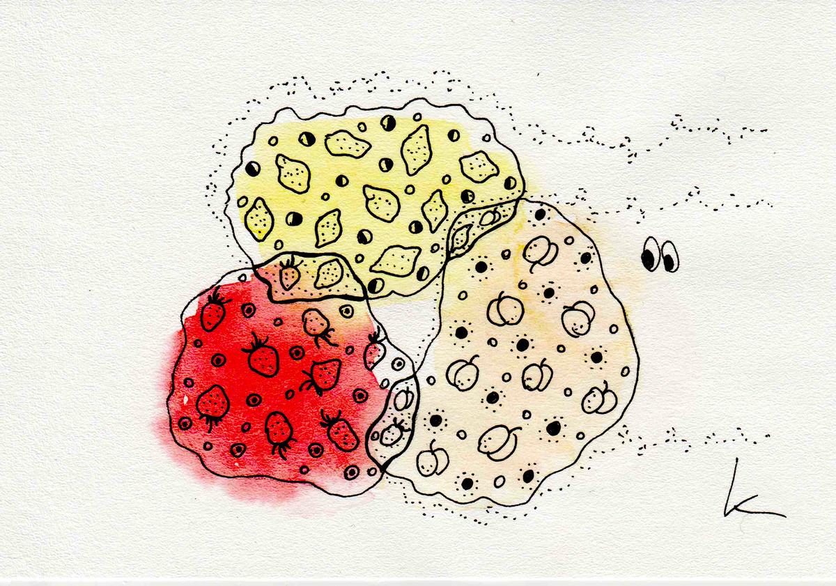 Собиралась ночью пить чай и искала в холодильнике, с чем бы это сделать. Всё самое вкусное уже было съедено любимыми детьми - и поэтому я выложила на блюдце остатки джемов - лимонного, персикового и клубничного. Получилось три лужицы, края которых тут же соединились друг с другом. На минуту я зависла над этой картинкой, пытаясь вспомнить - что же она мне напоминает. Вспомнила. Схему из трёх пересекающихся кружков "хочу-могу-надо", где в середине - то занятие, что приведёт к успеху. Я бы здесь только "надо" заменила на "востребовано". Это про выбор дела, которым можно заниматься долго и с удовольствием, поиск призвания, дела жизни, если хотите. Но вернёмся к нашему джему. Здесь всё не так серьёзно и чуть более эмоционально. Просто вот в этих местах соединения - получилось самое вкусное. Особенное. Не такое, как было до смешивания. Так и в реальности. Мы чему-то учились, что-то хорошо умеем делать, от чего-то кайфуем, что-то ещё пока про себя не знаем. И это всё - можно соединить в наше