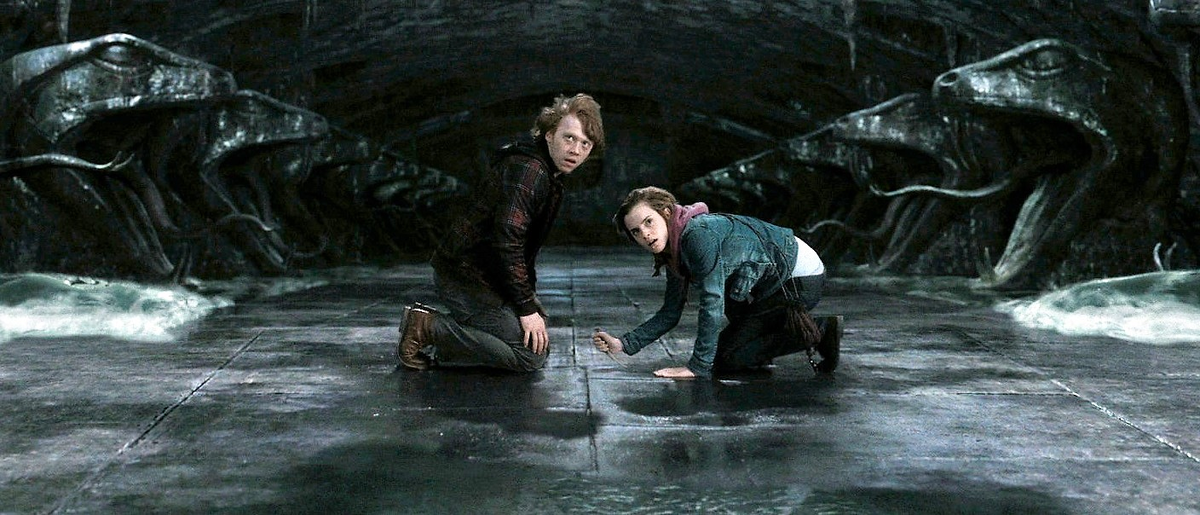 Уничтожение чаши происходит «за кадром». Более того, основная роль здесь отведена именно Рону – он придумывает спуститься в Тайную комнату за клыками василиска, он открывает дверь, скопировав змеиный язык Гарри (что, кстати, я считаю немного странным ходом). И по-рыцарски отдает Гермионе право уничтожить чашу.