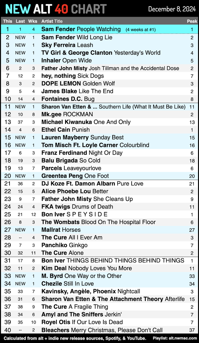Еженедельно рассчитывается на основе десятков альтернативных и инди-новинок и потоковой активности на основных сервисах. Последнее обновление: 8 декабря 2024 г.