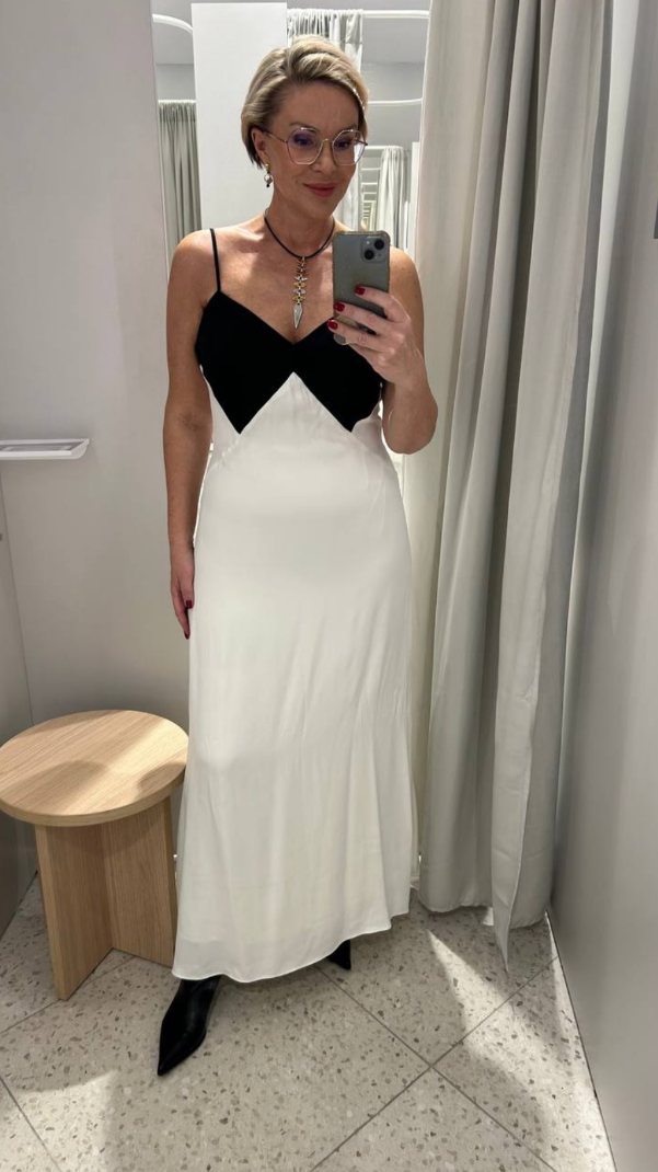 В новой коллекции бренда много черного, белого и молочного. Мне очень понравилось это платье на подкладке с красивым контрастным верхом из более плотной ткани. К нему будет очень просто подобрать обувь, сумку и аксессуары, потому что черно-белая гамма сочетается абсолютно со всем. Мне подошел 46 размер. Платье это я, кстати, купила, и уже готовлю для вас подборку образов с ним.