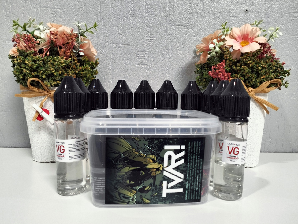 Приезжает это в таком варианте: Прозрачная коробка-контейнер с наклейкой Tvar! И етить там какая-то морзянка под названием. В которой лежат 10 бутылочек с премиксами, которые уже с ПГ. Сама коробочка с защитой первого вскрытия, да и удобно в транспортировке и хранении. Вторая коробка чисто только с бутылочками ВГ, в картонной коробке, но так же с пломбой!