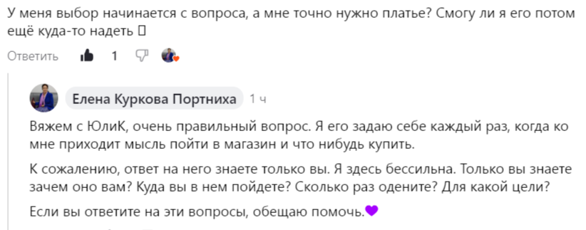 На что я ответила: «К сожалению, ответ на него знаете только вы. Я здесь бессильна. Только вы знаете зачем оно вам? Куда вы в нем пойдете? Сколько раз наденете? Для какой цели?