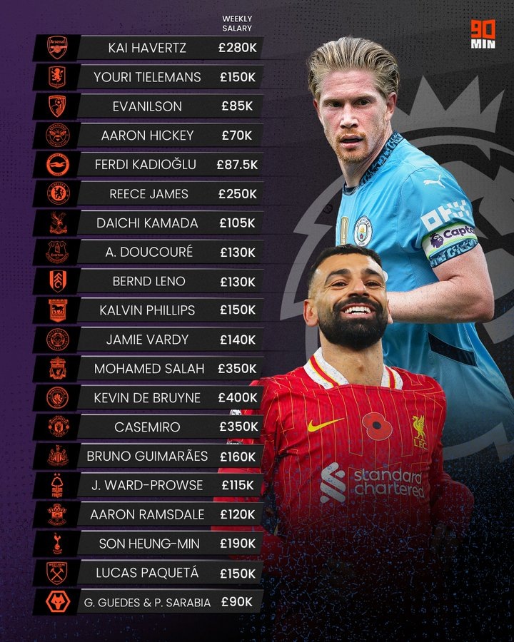 Премьер-лига известна щедростью на зарплаты футболистов. По данным ассоциации профессиональных футбольных скаутов Англии (PFSA), средняя зарплата игрока АПЛ составляет 60 млн фунтов стерлингов. Портал 90min вспомнил самого высокооплачиваемого футболиста из каждого клуба Премьер-лиги в текущем розыгрыше турнира. Обладателем самой высокой зарплаты в чемпионате предсказуемо стал Кевин де Брюйне, в неделю «Сити» платит бельгийцу 400 тысяч фунтов. Каземиро и Мо Салах – самые высокооплачиваемые игроки своих команд, с зарплатой в 350 тысяч в неделю они разделили вторую строчку общего рейтинга. Самая большая зарплата в «Арсенале» у Кая Хавертца, в неделю «канониры» платят немцу 280 тысяч – это третье место общего рейтинга лиги. Самые высокооплачиваемые игроки клубов АПЛ. Команды расположены в алфавитном порядке Фанатов некоторые суммы возмутили: 💭 «Каземиро живет лучшую жизнь! Выиграл все на свете с «Мадридом», а теперь просто кайфует от денег в Англии». 💭 «Хавертц, Каземиро, Рис Джеймс и Кэ