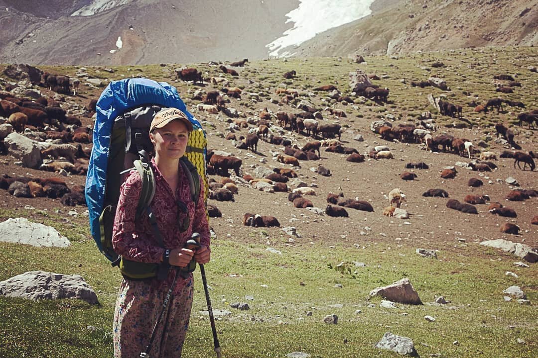 23 июля 2019 года (Фанские горы, день четвертый) К моей огромной радости, проснулась я в отличном самочувствии, голова не болела, и настроение было прекрасное!!! Похоже период аклиматизации прошел (очень на это надеюсь). А ведь еще вчера я очень переживала из-за этого. С сегодняшнего дня все будет по-взрослому! Начинаем восхождение с рюкзаками, и ослик нам больше не поможет, теперь все несём сами. Надеясь на лучшее, мы отправились в путь. Мне было немного страшновато, смогу ли я пройти сегодня. По пути встретили пастуха с бесчисленным стадом барашков и козликов. Нас пригласили отведать шашлык. Но нам предстоял ещё долгий путь, и мы вежливо отказались, хотя шашлычка ой как хотелось )) Лагерь пастухов. Похоже здесь живут целыми семьями. Цель на сегодня - Алаудинские озера, путь к которым лежит через Алаудинский перевал (3721). По дороге встретили вот такую веселую компанию )) Вот уж кто с детства акклиматизировался и привык к жизни в горах )) Камни, иногда встречается снег, рюкзаки тяже