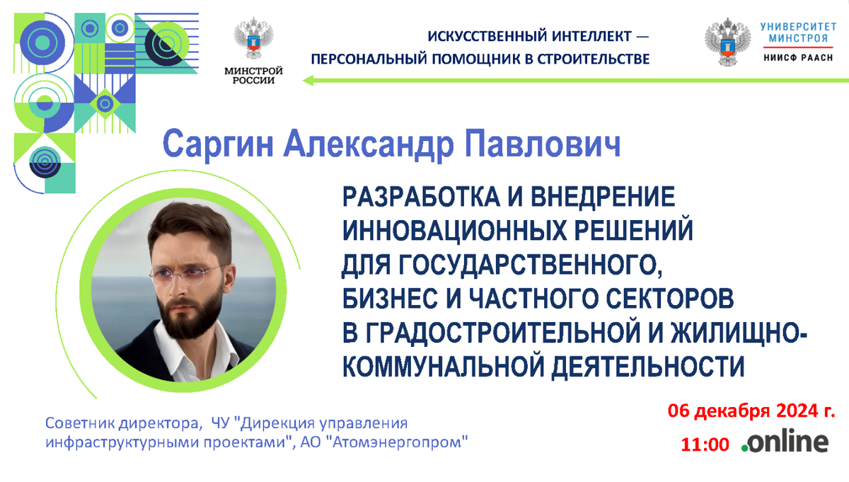 Вебинар. Разработка и внедрение инновационных решений для государственного, бизнес- и частного секторов в градостроительной и жилищно-коммунальной деятельности Вебинар проводится в рамках курса "Искусственный интеллект - персональный помощник в строительстве" ВИДЕО