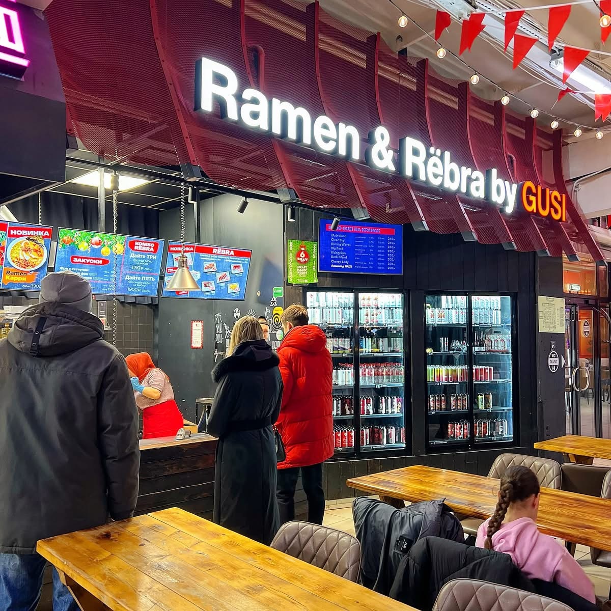 Rёbra медовые перцы из меню корнера Ramen&Rёbra by GUSI по 530 ₽. Подаются с салатом коул-слоу. В читательском голосования рёбра этого заведения заняли третье место. Вес рёбер указан как 350 г., а гарнира — 100 г. Всего в меню семь видов рёбер и отличаются они только глазурью. Выбрал пряную медово-перечную. Рёбра подают на металлическом подносе: основной кусок и два небольших довеска — это отличается от вида на фото в меню. Не могу сказать, что это выглядит очень аппетитно, тем более, инстаграмно. Плюс еще отсутствует веточка зелени. Тем не менее, суммарно получается лента на девять костей. Рёбра посыпаны порубленным перцем чили без косточек. Аромата гриля не зафиксировал. Салата коул-слоу много. Но он чуть пересолен. Мясо хорошо разварено, от кости отделяется разве что не взглядом. Само по себе мясо наимягчайшее. При этом медовость глазури практически не чувствуется. Впрочем, как и перечность. Общий вывод. Мясо на рёбрах неплохое, а вот глазурь что есть, что нет — на вкус почт