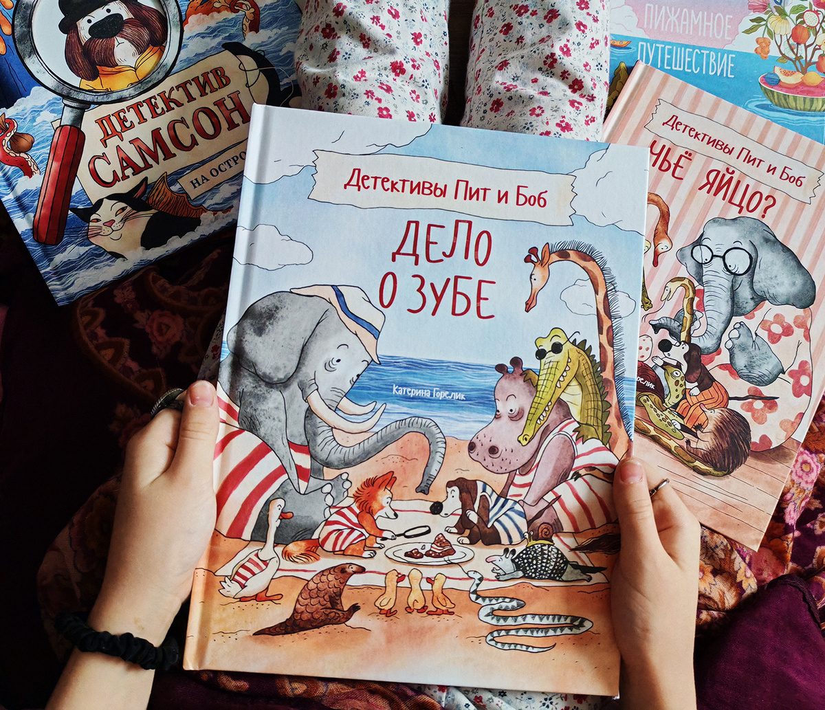 Как вы ответите на этот вопрос, не заглядывая в телефон и компьютер? Сколько зубов у слона? А у жирафа? Акулы? У броненосца? А есть ли зубы у панголина? Ответить на все эти вопросы можно прочитав новую книгу Катерины Горелик «Детективы Пит и Боб. Дело о зубе», вышедшую в издательстве «Поляндрия». Мы с дочкой очень любим книги этого автора и всегда их рекомендуем. Это вторая история про двух собак-приятелей-детективов-любителей. Читать книги можно в любом порядке, они независимы друг от друга. Катерина Горелик на встрече с читателями сказала, что ее книги предназначены дошкольникам. Моя дочка во втором классе, мы их читаем вместе с большим удовольствием. А еще с большим удовольствием узнаем что-то новое и рассматриваем авторские иллюстрации. Они всегда очень забавные, содержат массу мелких деталей и смешные моменты. В первой книге этой серии — «Детективы Пип и Боб. Чье яйцо?», мы с дочкой изучали тему, кто откладывает яйца и какие. Во второй книге — «Детективы Пит и Боб. Дело о зубе» уз