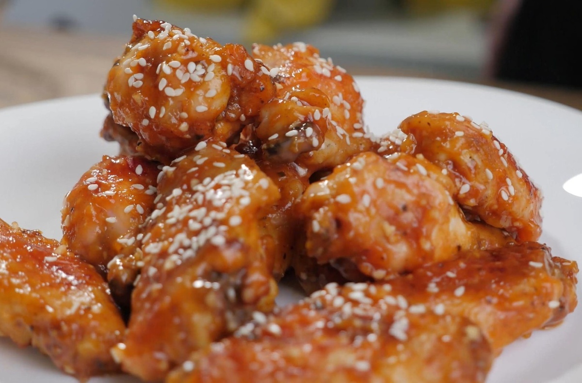 - Выложите готовые крылышки на блюдо и полейте медово-имбирным соусом. Подавайте горячими.