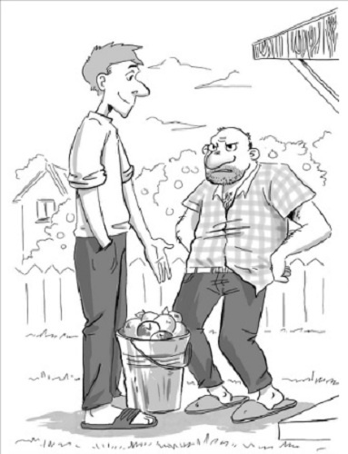 Через некоторое время видит – идёт к нему сосед. Ну, думает, и этот не выдержал. Радуется, на скандал настраивается. И вот открывает он дверь, а тот протягивает ему чистое отмытое ведро, наполненное самыми красивыми, отборными яблоками, и говорит: