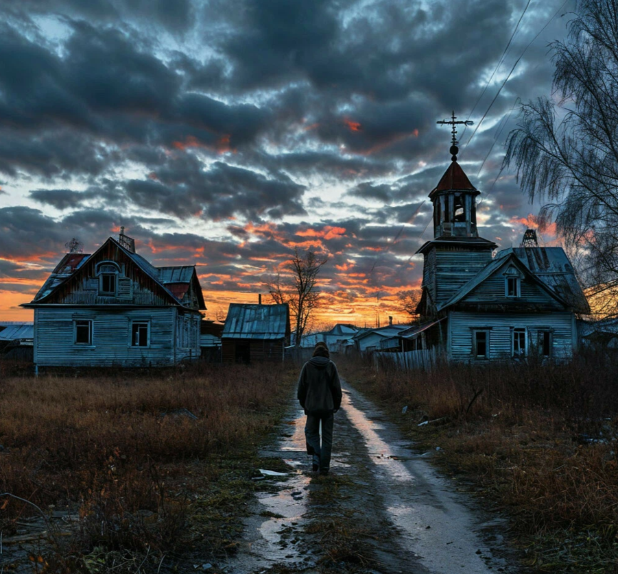 Въехав в деревню, мужчина стал медленно пробираться по извилистым улицам. Проезжая мимо очередного покосившегося деревянного дома, ему показалось, что кто-то мелькнул в черном дверном проеме. Он резко остановил автомобиль и в открытое окно крикнул неизвестному: