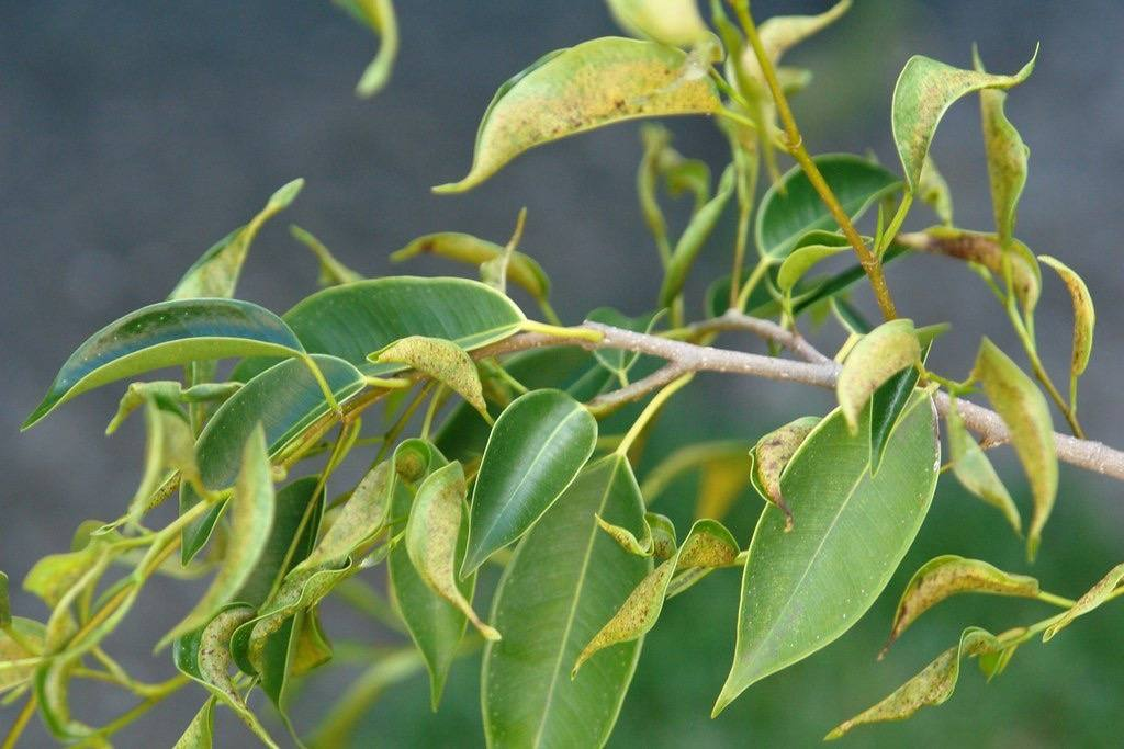 Трипсы могут быть как желтого, так и черного цвета, а их влияние на фикус заметно не сразу. Признаки их присутствия проявляются через несколько дней или недель, когда повреждения становятся очевидными.