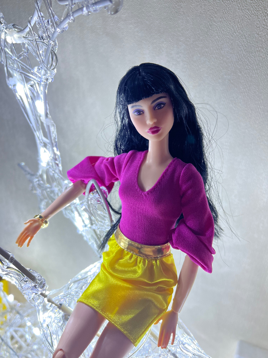 Привет! Ура, к нам приехала новая жительница кукольного дома! Хоть Лина и один из любимейших Молдов, но насчёт этой девочки у меня были сомнения. Все же я не фанат такого светлого скинтона. Но сочетание темных волос и светлых глаз мне очень нравится, и не только у кукол, но и у людей. Так что, все решил случай. На канале @dolidudo_o_barbie пару недель назад я увидела анонс новогодних открыток с барби. Там Лина позировала в чёрном вечернем платье на фоне праздничной гирлянды. И настолько мне запала в душу эта фотография, что я решила - Лина 19 должна поселиться и у меня. Я нашла ее на Авито НРФБ по приемлемой цене. И вот, в минувшую пятницу куколка добралась до меня! Сразу же захотелось ее поснимать. Девушка представилась. Моргана. В ее жизни было всякое, в юности она была стала готессой, что отразилось не только на имидже, Моргана на полном серьезе считала себя потомком древнего вампирского рода. Тут сыграло роль происхождение нашей героини, родилась и выросла она в Трансильвании в Р
