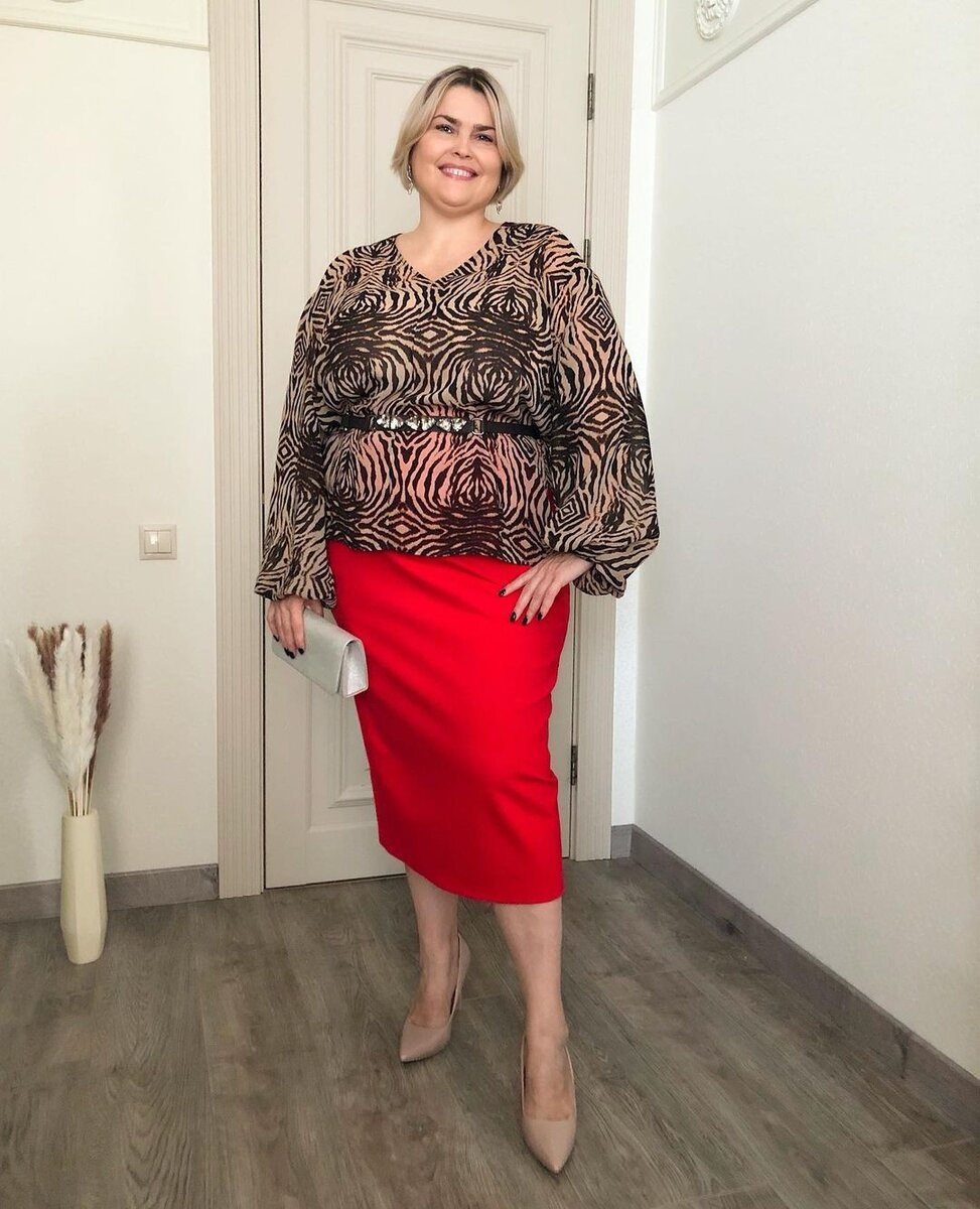 Полные женщины умеют быть привлекательными – правильно подобранная одежда способна не только скрыть их недостатки, связанные с лишним весом, но и подчеркнуть достоинства. Эффектная одежда, стильная и яркая, хорошо смотрится на дамах с пышными формами, если она правильно подобрана и учитывает все особенности их фигур. 1. Оригинальная полупрозрачная черно-коричневая блузка с абстрактным принтом выглядит элегантно и хорошо прикрывает лишние килограммы на животе и боках, а ее длинные рукава скрывают объемность рук. Блузка с изящным черным ремешком сверху хорошо сочетается с ярко-красной прямой юбкой, благодаря которой бедра выглядят стройнее, а ноги длиннее. В целом образ получается достаточно элегантным и даже изящным, а бежевые «шпильки» еще больше дополняют эффект стройности. 2. Изящный приглушенно-серый костюм – прямые брюки со стрелками и жакет с накладными карманами и поясом на талии – создаст эффект стройности фигуры даже на пышной женщине. Прямые линии, спокойный оттенок, чуть завы