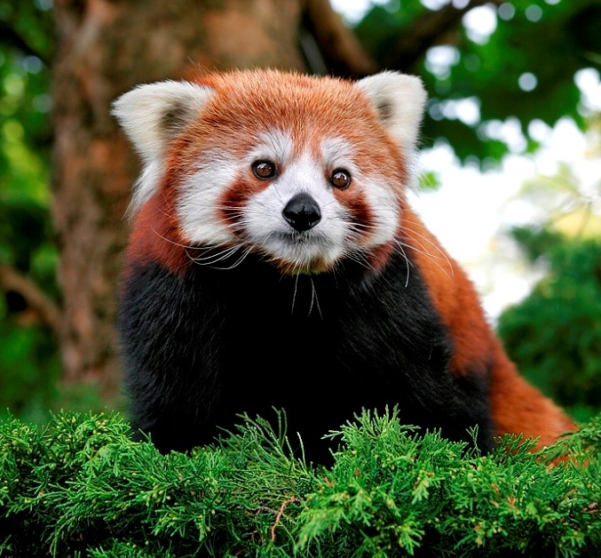 Красная панда – небольшое хищное животное из семейства пандовых. Короткая острая мордочка, пушистый полосатый хвост и шоколадно-рыжая шерстка: огненная лиса – так прозвали этого необычного зверька в Китае еще в 13 веке за яркую миловидную внешность. Известно два вида этих животных: красная панда Стайана, обитающая в южной части Китая, и западная красная панда, населяющая Бутан и Непал. Латинское имя этого зверька переводится как «блистающая кошка». Мордочка красной панды покрыта белыми полосками, как у енотов, и этот узор уникален для каждой особи. С большой пандой это животное роднит только имя и общий предок, живший на земле миллионы лет назад. Красные панды – лесные жители. Густые смешанные и хвойные леса – излюбленное место жительства этих зверьков. Красная панда – хищник, но большую часть ее рациона составляют побеги и листья бамбука, ягоды, плоды и грибы. На животную пищу этот зверь переходит зимой, тогда добычей панды становятся мелкие грызуны и птичьи яйца.