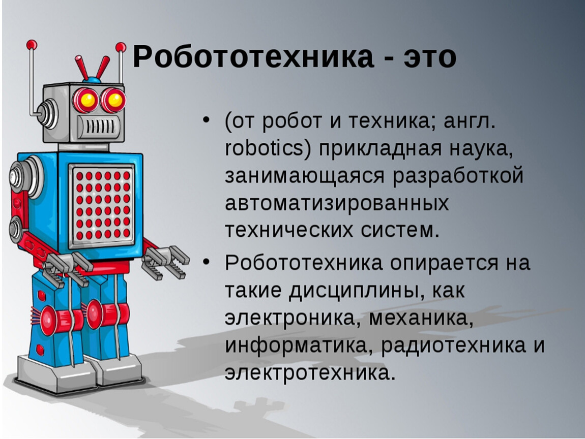 Всем читателям пламенный привет .! Давайте сегодня побеседуем с вами о робототехнике , что же это такое ? Что такое робототехника простыми словами? Робототехника простыми словами — это прикладная наука о создании и использовании роботов. Говоря по-простому, она занимается проектированием, постройкой и программированием роботов. В состав робототехники входят различные компьютерные и инженерные науки, такие как программирование, радиотехника, электротехника, механика, информатика, мехатроника, электроника, биоинженерия, телемеханика и многое другое. Некоторые основные понятия и термины робототехники: Виды робототехники Существует множество способов классификации роботов. Вот некоторые из них: По стационарности: стационарные и мобильные. Также можно выделить следующие категории роботов в зависимости от целей, для которых они созданы: Исследовательские роботы: с помощью таких роботов учёные и инженеры выясняют, какие функции в принципе можно реализовать в роботах. Автоматические тр