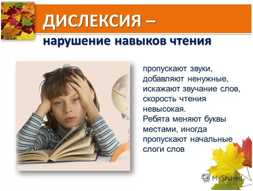 Дислексия — это расстройство чтения и письма, которое часто развивается в детском возрасте. Оно характеризуется сложностями в усвоении и применении письменных символов. Дети с дислексией могут испытывать затруднения с правильным распознаванием и анализом звуковой структуры слов, а также с пониманием связи между буквами и их звучанием. Расстройство может проявляться по-разному в зависимости от типа языка, на котором читает человек. Для диагностики дислексии необходимо провести комплексное обследование ребёнка с участием различных специалистов: логопеда, психолога, невролога, отоларинголога, офтальмолога. Лечение дислексии направлено на улучшение речевых и неречевых навыков у людей с этим нарушением. В большинстве случаев дислексия развивается как следствие внутриутробного органического повреждения центральной нервной системы после гипоксии, инфекционных заболеваний или токсического воздействия. Несколько реже причиной дислексии становятся генетические факторы и наследственность. Исс
