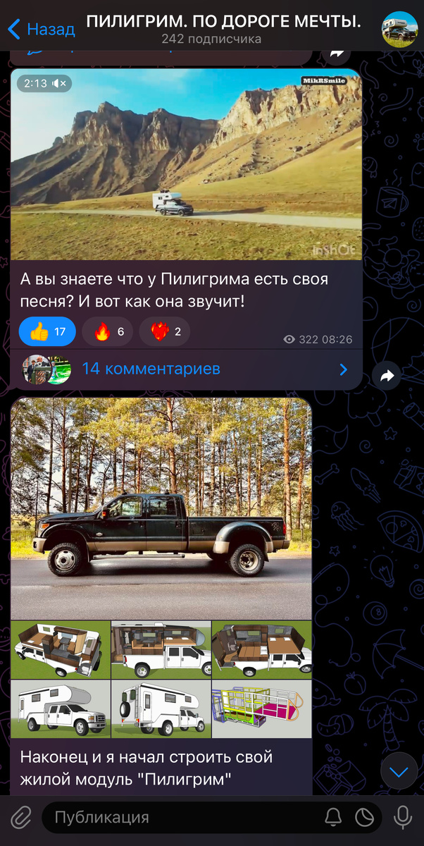 Всем привет. 7 лет подряд пишу тут про свою мечту, хобби, которое стало делом моей жизни. Я проектирую, строю жилые модули для пикапов всех типов. Путешествую на них с семьей уже много лет. И тут я понял что длинные статьи про нас удобно для чтения на компе, вдумчиво с фото и видео. Но в наш век «куда то спешим», все время в дороге, в пути, самое удобное это телефон в руке. А там самый удобный вариант это Телеграм. Ну вот и я решил завести канал «Пилигрим. По дороге Мечты» (кстати. Может кто подскажет варианты по интереснее для названия канала? Там будут ежедневные новости, анонсы новых видео, живое общение и т.д. Прошу поддержать мой канал. Постараюсь быть интересным. Короче, вот. https://t.me/piligrimcamperclub