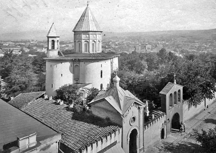 В Тбилиси самая центральная по своему расположению - церковь Кашвети. Так-то она Святого Георгия, а её название, дословно "камнерождение", восходит к легенде о святом Давиде Гареджийском, которого некая женщина обвиняла в своей внебрачной беременности... а потом тут камень родила. Прошлый храм (1753) был неказист, но это если ничего не знать про церкви-крепости Восточной Европы: Нынешний храм в 1904-10 годах на деньги грузинских промышленников во главе с коньячным королём Давидом Сараджишвили построил немец на русской службе Леопольд Бильфельд, и это пожалуй ярчайший в Грузии образец архитектуры национального возрождения. В Тбилисскую войну зимой 1991-92 годов церковь служила местом переговоров между сторонниками президента Звиада Гамсахурдиа и лидеров оппозиции Тенгиза Китовани и Джабы Иоселиани, но под конец тоже не избежала огня: Однако - сохранилась отлично. Тем более Кашвети не закрывалась в советское время, а в 1947 году её даже расписал Ладо Гудиашвили, улица которого проходит т