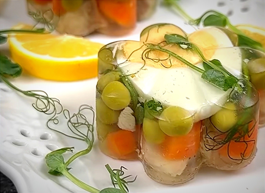 Заливная курица – это не просто блюдо, это кулинарная легенда! Сложно представить Новый год без этого волшебства, правда? Эта традиция – в наших генах! А мы сделаем её ещё ярче и интереснее! Готовим порционное заливное в силиконовых формочках – стильно, удобно и невероятно вкусно! Яйцо отварное – 1-2 шт. (для красоты и вкуса!) Бульон – основа всего! В кастрюлю кладем филе курицы и целую очищенную морковь. Заливаем водой. Доводим до кипения, снимаем пену – это важно для прозрачности бульона! Варим на маленьком огне 25 минут. Солим и перчим по вкусу. Аромат должен быть невероятным! Мясо и овощи – готовим к волшебству! Вынимаем мясо и морковь из бульона. Мясо разбираем на волокна – тонкие, аккуратные. Морковь нарезаем меленькими кубиками. Формочки – маленькие шедевры! На дно каждой формочки кладем немного зелени петрушки, кружочек отварного яйца, горошек, морковь и куриное мясо. Создаем красивые слои – как в настоящем произведении искусства! Желатин – волшебный ко