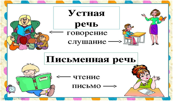 Из перечисленных видов речевой деятельности говорение и слушание относятся к устной речи, а письмо и чтение — к письменной.
