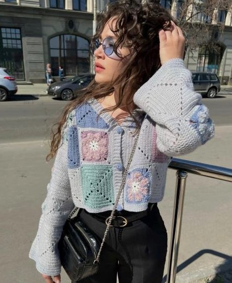 При желании, добавив один ряд квадратов по низу изделия, можно превратить короткий жакет в полноценную кофту.