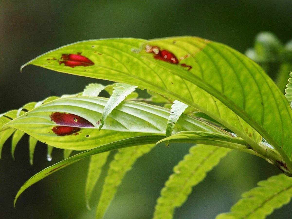 Растение характеризуется крепким, но гибким стеблем, на котором располагаются необычные листья. Каждый листочек по форме напоминает сердце, а его поверхность покрыта густыми волосками, придающими ему бархатистую текстуру. Именно эти листья и являются главной «изюминкой» растения — ярко-красные пятнышки в виде сердечек, которые явно выделяются на темно-зеленом фоне, создавая удивительный контраст.