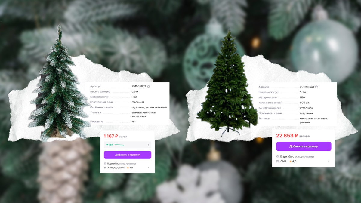 Искусственные ели делают из разных материалов – лески, полиэтилена и ПВХ. Самыми дорогими считаются литые деревья – они больше всего похожи на настоящие, а также более долговечные. Ёлка из ПВХ считается наиболее доступным и популярным у россиян вариантом. При производстве тонкие листья материала нарезают на полоски и крепят к веткам на проволоку. Деревья получаются пушистыми, однако они мало напоминают живые ели. Цена такой ёлки на маркетплейсах варьируется от 1 100 рублей – за 60 см – до 22 тыс. рублей за 180 см. Ёлки из лески немного дороже, чем из ПВХ. Из-за материала дерево больше напоминает сосну. Но чаще всего у таких «хвойных» слишком длинные и редкие иголки. Чаще всего леску соединяют с ПВХ. На маркетплейсах можно купить разные варианты ёлок из лесок, например, со снежным напылением, инеем или шишками. За дерево придётся отдать от тысячи до 20 000 рублей – стоимость зависит от украшения «хвойного» и его высоты. Самыми дорогими искусственными ёлками являются литые деревья – из п