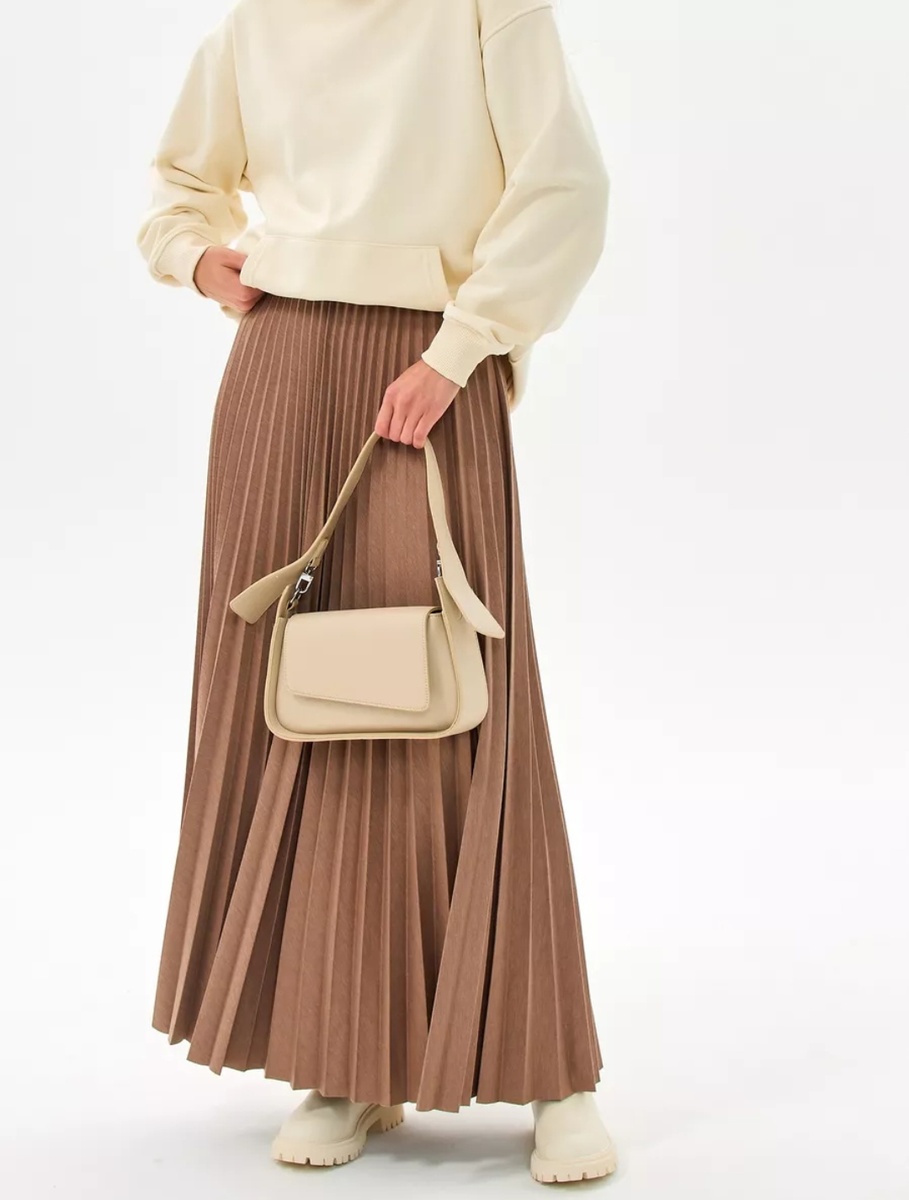 Эта плиссированная юбка привлекает внимание своим элегантным дизайном и универсальным коричневым цветом.