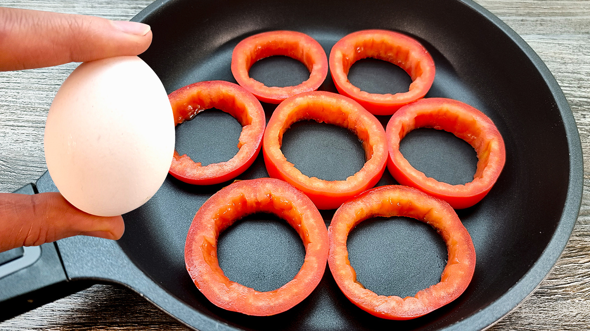 Простой и легкий завтрак. Получается очень сочно и вкусно. Моя семья любит такие завтраки. Можно комбинировать с различными мясными добавками и любимыми специями. всегда будет блюдо с новым вкусом. Ингредиенты: 3 помидора; перья зеленого лука; 2 яйца; соль, перец; сливочное масло - немного; немного сыра; Способ приготовления: Помидоры порезать кружочками и удалить середину. Вынутую се