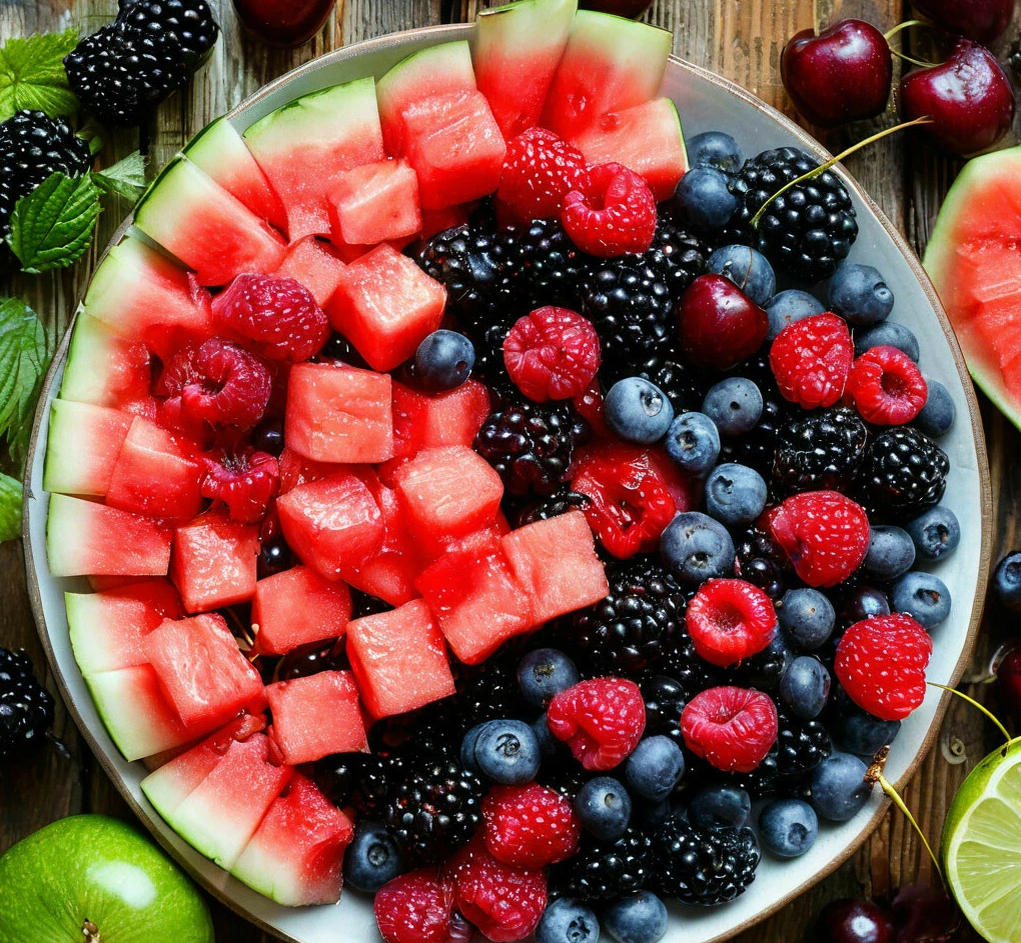 - Смешайте все компоненты: В чаше соедините арбуз, голубику, малину и ежевику. Аккуратно перемешайте, чтобы не повредить ягоды. 💖