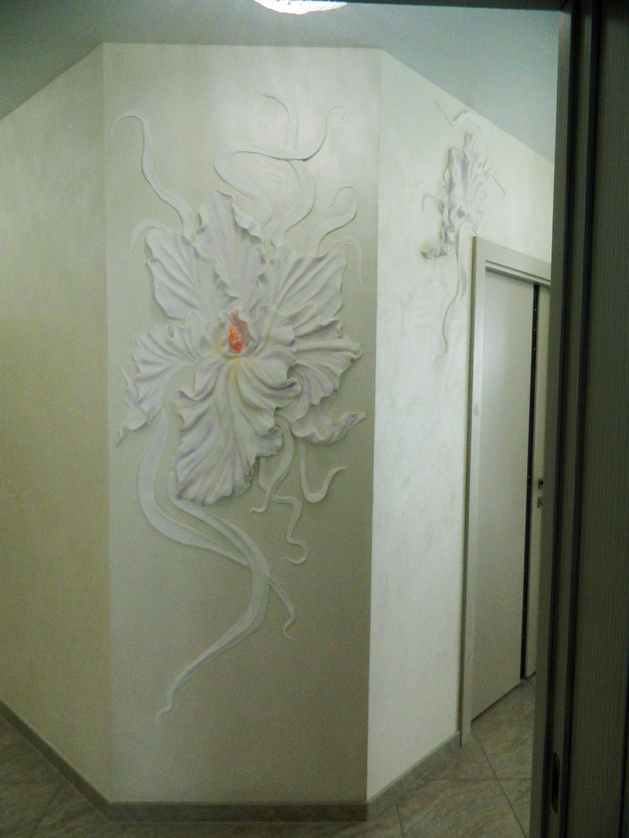 Это пустое пространство так и просится для декора. Обычно такие места занимают зеркалом, картиной, росписью, барельефом. Но, в этом случае, меня пригласили по другой причине. Новый дом, быстро построенная высотка. Стены дают усадку, в результате чего возникают трещины. Вот и у этой клиентки пошли трещины, при чём заделать их незаметно, без переделки всей стены практически невозможно. На стенах декоративка, это значит, что целостность фактуры покрытия будет нарушена, и любой шов замаскировать будет невозможно. В таких случаях барельеф- лучший выбор. Форма цветка такова, чтобы полностью закрыть трещину, которая имела несколько тонких ответвлений. Можно заметить, что справа, вверху, над дверным откосом, я сделала ещё один фрагмент. Да, там тоже пошла трещина, и её замаскировали цветком поменьше. На фото ниже покажу детали. Вот такой небольшой фрагмент полностью замаскировал трещину. это действительно удобная и надёжная форма маскировки, так как вероятность дальнейшего распространения т