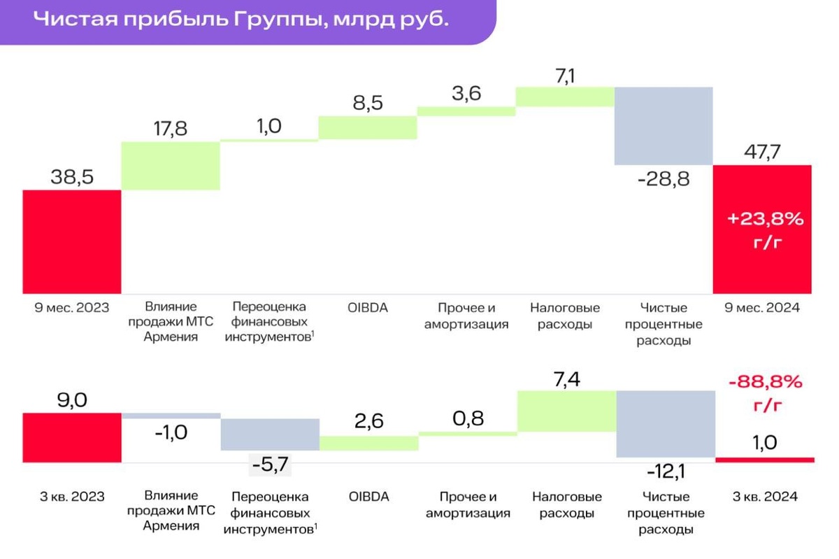 Когда ставка ЦБ тестирует исторические максимумы, а кредитные риски выходят на первый план, инвесторы обязаны пристально следить за «должниками». Теми компаниями, которые в эпоху низких ставок набрали обязательств, и теперь могут испытывать проблемы. Одной из таких компаний является МТС. В этой статье разбираем отчет за 9 месяцев 2024 года и риски для телекома. Итак, выручка компании за отчетный период выросла на 17% и превысила 512 млрд рублей. Напомню, что за период с 2019 по 2022 год включительно, годовая выручка МТС составляла около 0,5 трлн рублей, и только за 9 месяцев текущего года показала такую сумму. Результаты группы по-прежнему пушат основной сегмент сотовой связи и финтех направление. Абонентская база в России увеличилась год к году на 1,1 млн до 81,9 млн абонентов, а выручка Финтех направления только за 3 квартал увеличилась на 37,4%. Медиахолдинг, кикшеринг и Adtech также растут по выручке, но все еще низкоэффективны. 💬Далее о проблемах. Чистый долг Группы вырос в 3 ква