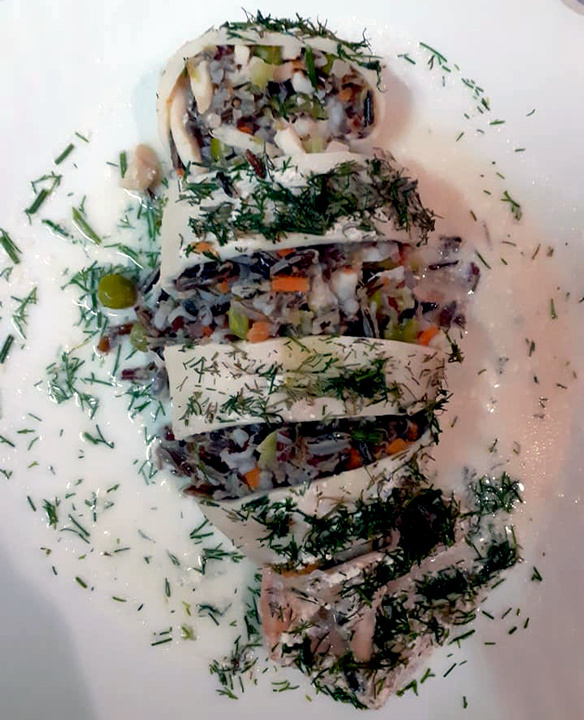 Точнее, кальмары, фаршированные кальмарами. Купила 5 тушек кальмаров. В размороженном виде получилось граммов 800. Покупные чищенные не люблю - вкус у них совершенно другой. После того, как самая неприятная часть закончилась (чистка кальмара снаружи и изнутри), приготовила начинку: Рис черный, рис дикий ( 2 пакетика по 80 г) отварила 10 минут. Добавила замороженную смесь «Летние овощи» (граммов 200) и еще 5 минут поварила. Из 5 кальмаров 3 оставила целыми, а 2 нарезала на мелкие полоски для смешивания с начинкой. Начинку перемешала. Кальмары нашпиговала начинкой, положила в сковородку. В это время кипятился чайник. После закипания чайника пачку сметаны (300 г) выложила в миску, налила немного соевого соуса, пару-тройку ложек оливкового масла и залила кипятком. Сметана сразу хлопьями пошла, но это не помешало мне залить всю смесь в сковородку. Поставила на огонь, предварительно прикрыв крышкой, на 10 минут. КБЖУ на 100 г – 104/9,2/3,4/7,7. + 8 фото Рецепт на странице Автор рецепта – Лил