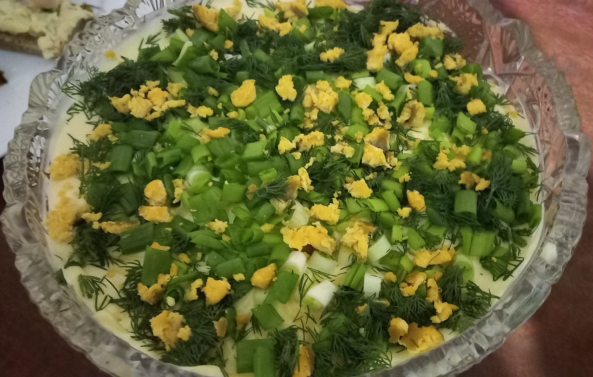 Вареную куриную грудку отвариваем и выкладываем первым слоем в салатницу или в кулинарное кольцо. Сверху - сеточка из майонеза. Далее - слой тертых вареных яиц, далее слой жареных шампиньонов с репчатым луком, сеточка из майонеза. Далее слой тертого сыра, сеточка из майонеза. Сверху слой нарезанной мелко зелени - зеленого лука и укропа, и немного желтка одного яйца. Салатик готов!