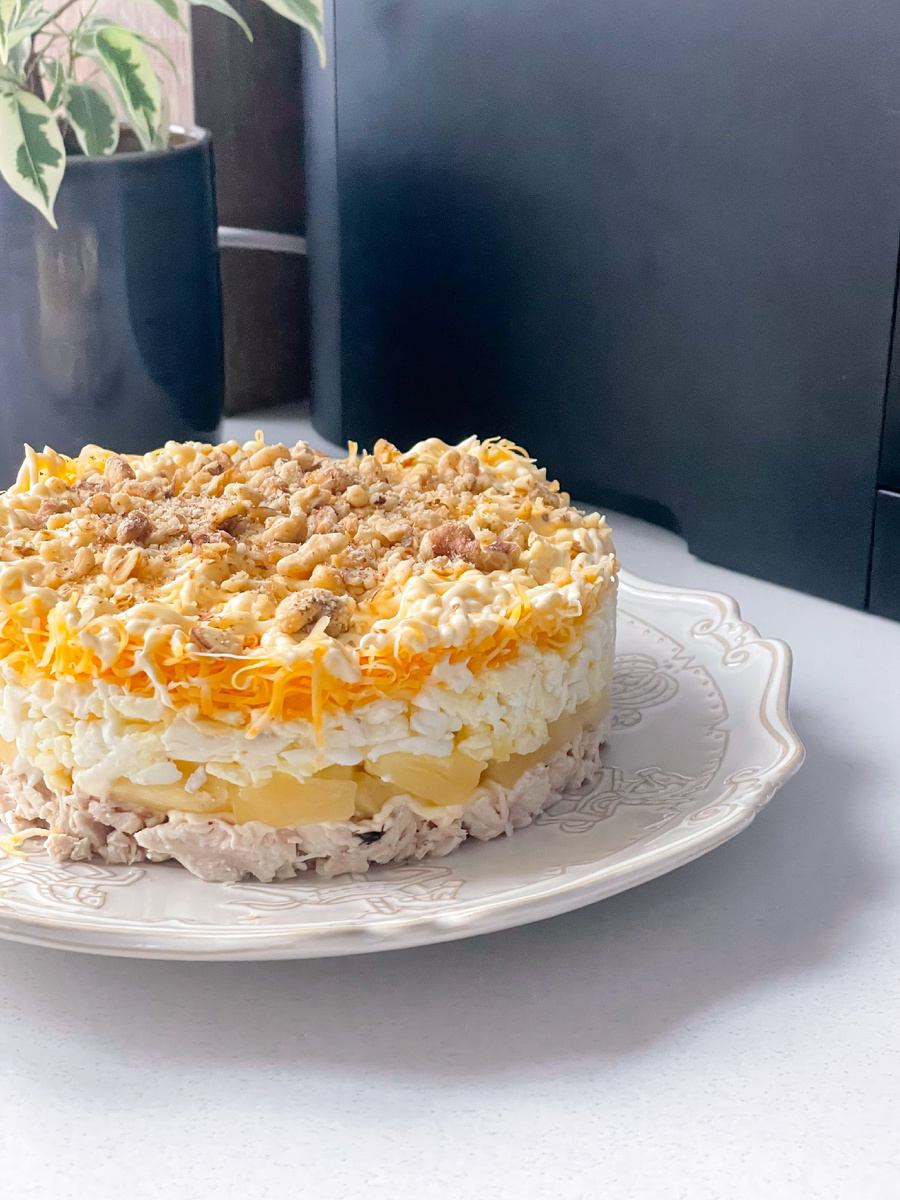 Очень вкусный! Муж не ест ананасы и сочетание это не понимает, но этот салат ест всегда с удовольствием!) Ингредиенты: Количество не пишу. Зависит от размера вашего блюда, но все ингредиенты берём примерно в одинаковом объеме. Можно взять глубокую салатницу, а можно как я тарелку и кондитерское кольцо. Выкладываем всё слоями, вареную курицу посолить и поперчить. Все слои промазать майонезом. Я майонез переложила в кондитерский мешок и отрезала кончик, чтоб отверстие было маленьким. Так удобнее покрывать слои, чем пытаться размазать майонез ложкой) На видео все понятно: Приятного аппетита! ♥️