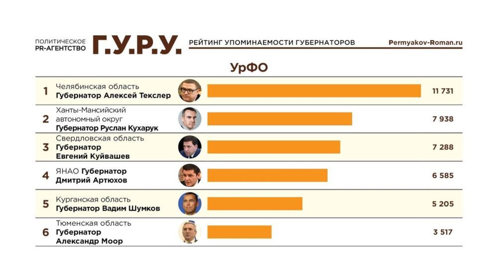 Взлетел на 13 место глава Ханты-Мансийского автономного округа Руслан Кухарук с 7 938 упоминаниями. Яркое и необычное событие месяца — практически прямое подтверждение факта захода «группы» вице-премьера РФ Марата Хуснуллина на Урал. Показательная встреча и порция похвалы такого уровня — дает интересные и даже конспирологические версии. Будем наблюдать.