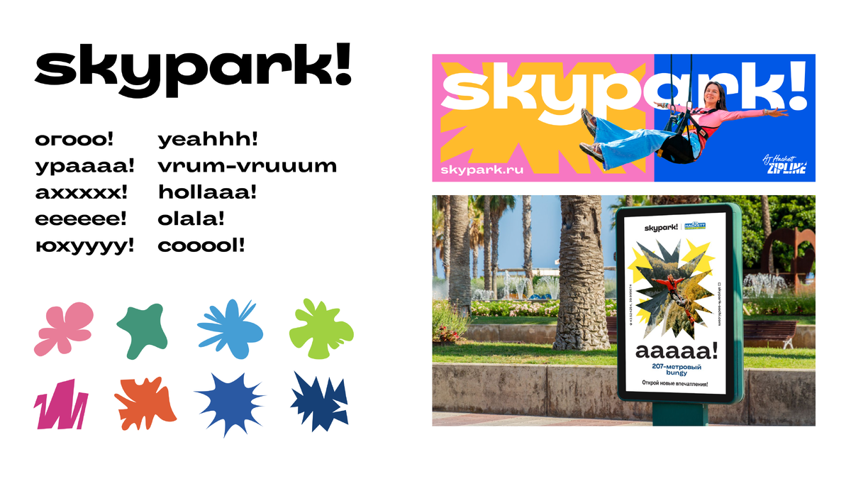 В 2019 году с помощью наших друзей из брендингового агентства PLENUM, мы пересобрали бренд. Нам необходимо было разработать новое позиционирование парка и визуальную систему, привлекательную и для тех, кто пришёл за экстримом, и для людей, которые к нему не готовы. Нам удалось снизить градус адреналина, унаследованного от бренда AJ Hackett. Ориентируясь на различные аудитории, которые мы описали благодаря целому ряду исследований, вместо приключенческо-адреналинового Skypark AJ Hackett Sochi, появился модный и современный Парк уникальных впечатлений Skypark! Что касается дизайна — мы выбрали самый смелый вариант, основанный на динамичных графических формах. Это не самый стандартный инструмент, которым надо учиться пользоваться, но зато более эмоциональный. Новая яркая айдентика подчёркивала весь спектр впечатлений и эмоций, которые гости получают в парке, и помогла нам найти подход в коммуникации с абсолютно разными категориями потенциальных гостей.
