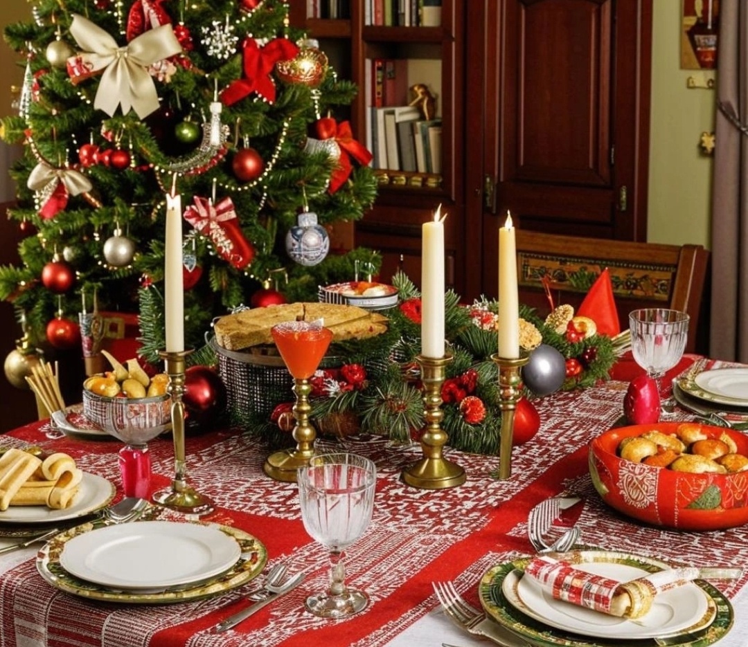Создание праздничной атмосферы на новогоднем столе — важная часть подготовки к празднику. Вот несколько советов по оформлению новогоднего стола: 1. Цветовая гамма - Классические цвета: Красный, зеленый, золотой и серебряный. Эти цвета символизируют радость, природу и богатство. - Белый и синий: Для создания зимней сказки можно использовать бело-голубую гамму, напоминающую заснеженный лес. - Эко-стиль: Натуральные оттенки дерева, зелени и коричневый цвет создадут уютную и природную атмосферу. 2. Скатерть и салфетки - Выберете скатерть подходящего цвета. Она может быть однотонной или с узорами (елочки, снежинки, звезды). - Салфетки можно подобрать в тон скатерти или контрастного цвета. Их можно красиво свернуть и положить на тарелки или рядом с ними. 3. Центральная композиция - В центре стола можно разместить композицию из еловых веток, шишек, свечей и декоративных элементов (ягоды, ленты, блестки). - Свечи создают уютную и романтичную атмосферу. Используйте высокие свечи