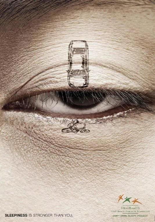 «Сонливость сильнее вас» — это кампания с одним изображением, созданная компанией Thai Health и использованная в их проекте «Не садитесь за руль сонными», сентябрь 2010 года. В этой рекламе послание разделено на две части: