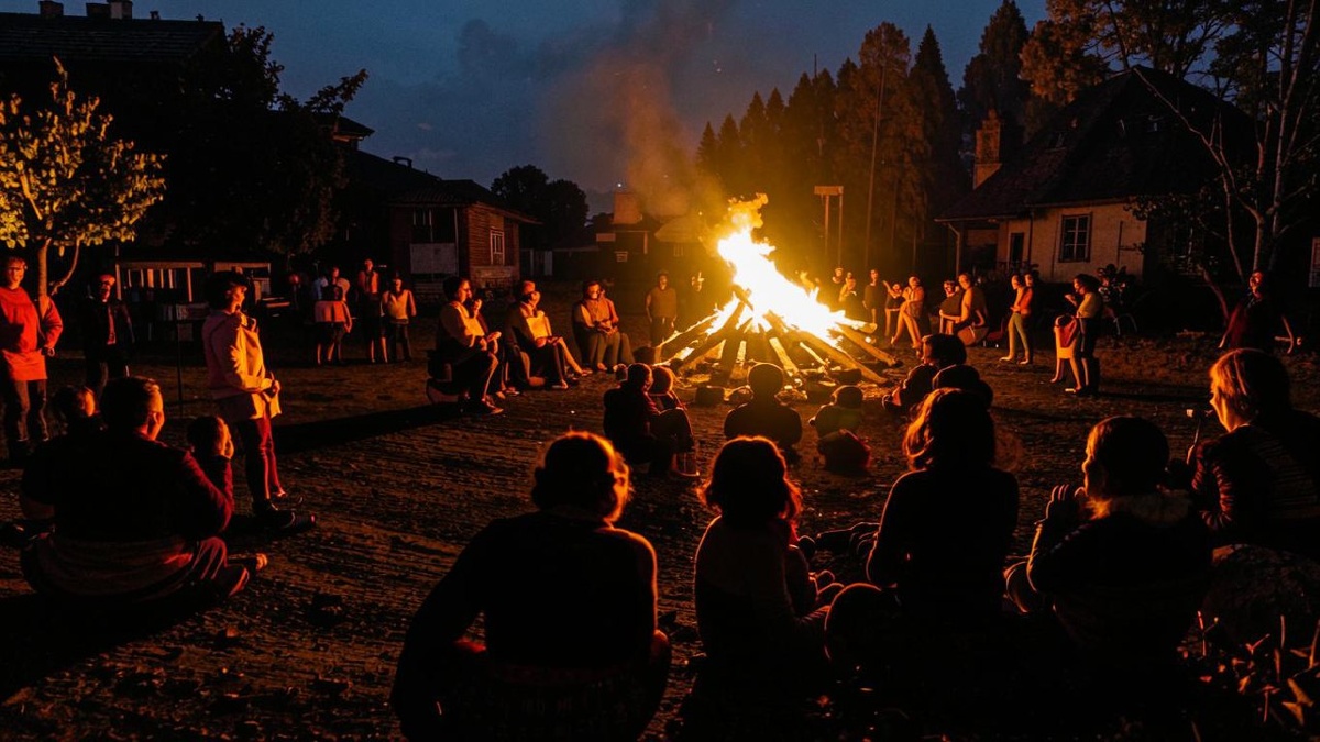 Вечер медленно окутывал поселение своим мягким светом. Огни костров танцевали в темноте, освещая лица жителей, собравшихся на площади. Среди них были и Кай, Окс и Тим, которые устроились на скамейке, наблюдая за игрой пламени. Шум смеха и разговоров наполнял воздух, создавая атмосферу уюта.