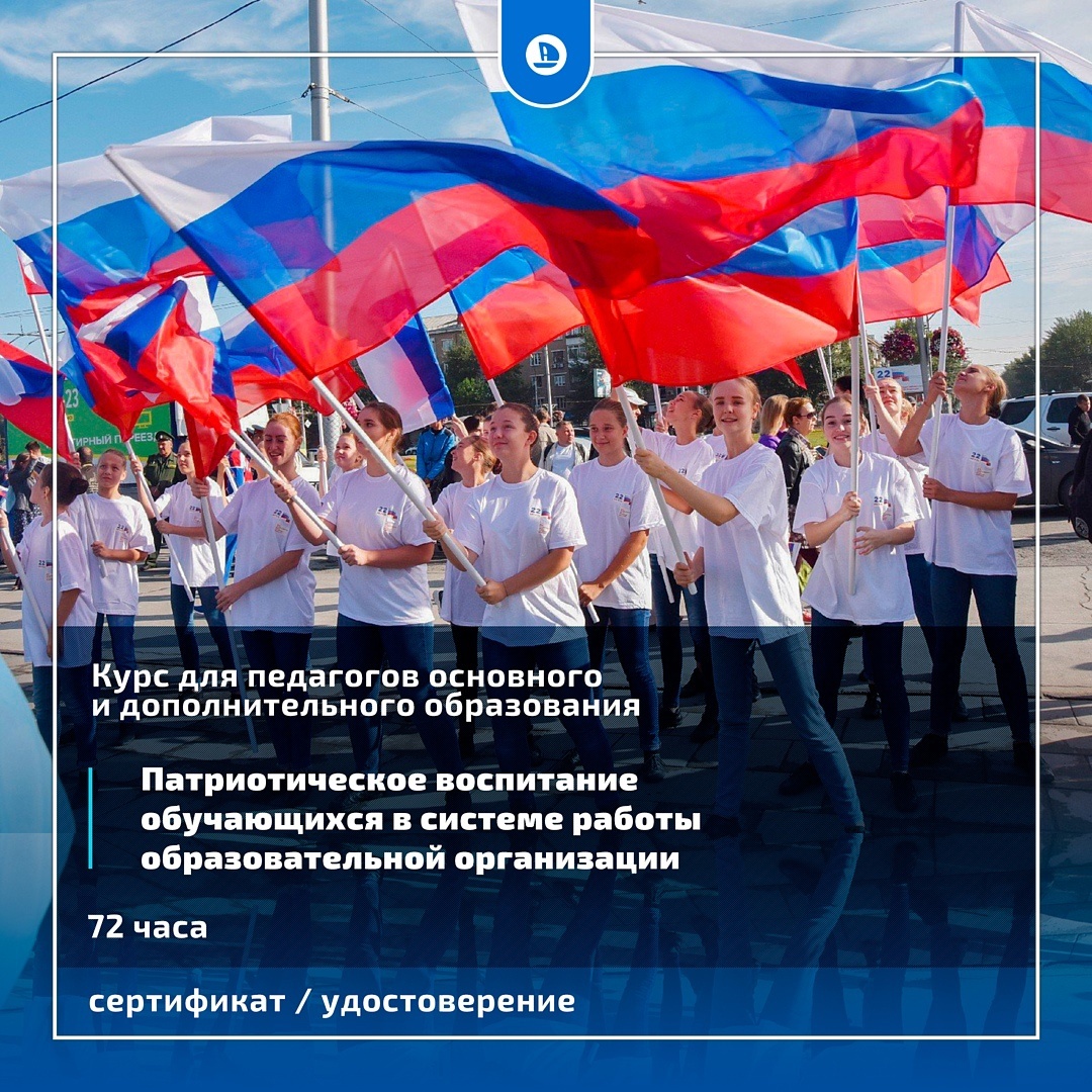 Приглашаем педагогов изучить курс повышения квалификации «Патриотическое воспитание обучающихся в системе работы образовательной организации в соответствии с ФГОС». Объём курса: 72 часа По итогам выдаётся удостоверение о повышении квалификации или сертификат (если у вас нет высшего или среднего профессионального образования). Изучив курс, вы усовершенствуете и разовьёте следующие компетенции в соответствии с профессиональным стандартом: - Овладение теоретическими знаниями и принципами, включая понимание структуры и сущности патриотического воспитания. - Умение применять модель патриотического воспитания школьников на практике. - Понимание технологии разработки программ гражданско-патриотического воспитания. - Расширение педагогического инструментария патриотического воспитания школьников. Материалы курса размещены на сайте https://attestatika.ru/kursy/kurs-dlya-pedagogov-osnovnogo-i-dopolnitelnogo-obrazovaniya-o-patrioticheskom-vospitanii-shkolnikov/