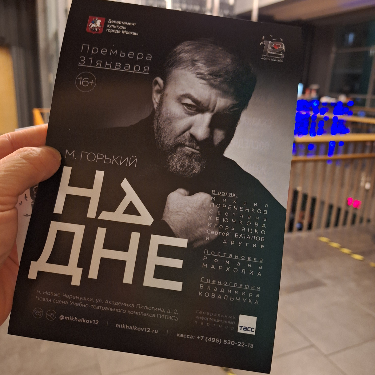 На сцене Театра "Мастерская 12 Никиты Михалкова" с успехом прошла премьера спектакля по одноименной пьесе М. Горького "На дне" в постановке Романа Мархолиа. Пьеса написана более 120 лет назад и очень любима театральными подмостками. Перед началом спектакля зрителям делают небольшой экскурс в историю создания этого произведения, рассказывая, что первоначальные названия пьесы были такие: "Без солнца", "Ночлежка", "Дно", "На дне жизни". На сцене зрители видят ночлежку, но не ту, которую мы все представляем из начала прошлого века, вспоминая советские фильмы, а скорее похожую на современный капсульный отель или космический корабль, который бороздит околоземные просторы. Именно так режиссер спектакля видит современную ночлежку: "Это место, где ты не чувствуешь себя дома. Временное пристанище. Между небом и землёй". Каждое окошко - это койкоместо одного из жильцов этого странного дома. У каждого жителя своя история, все они разные и им приходится притираться друг к другу, но есть одно,