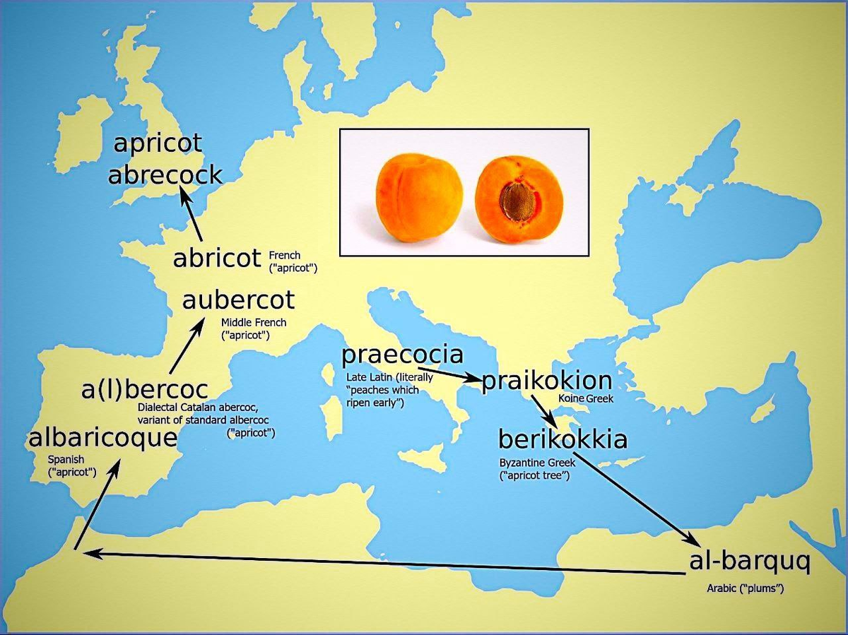 🍑 англичане сначала услышали от кого-то "abrecock", а потом под французским влиянием сделали из него "apricot"
