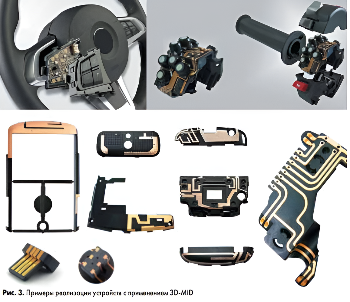 Особенности конструкции устройств 3D-MID предопределили области их предпочтительного применения — в настоящее время это автомобильная электроника, промышленная автоматизация, телекоммуникации, медицинские технологии, потребительская электроника (рис. 3).